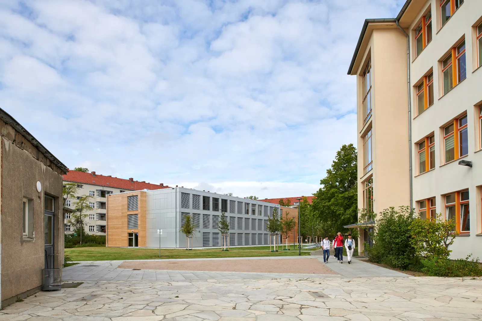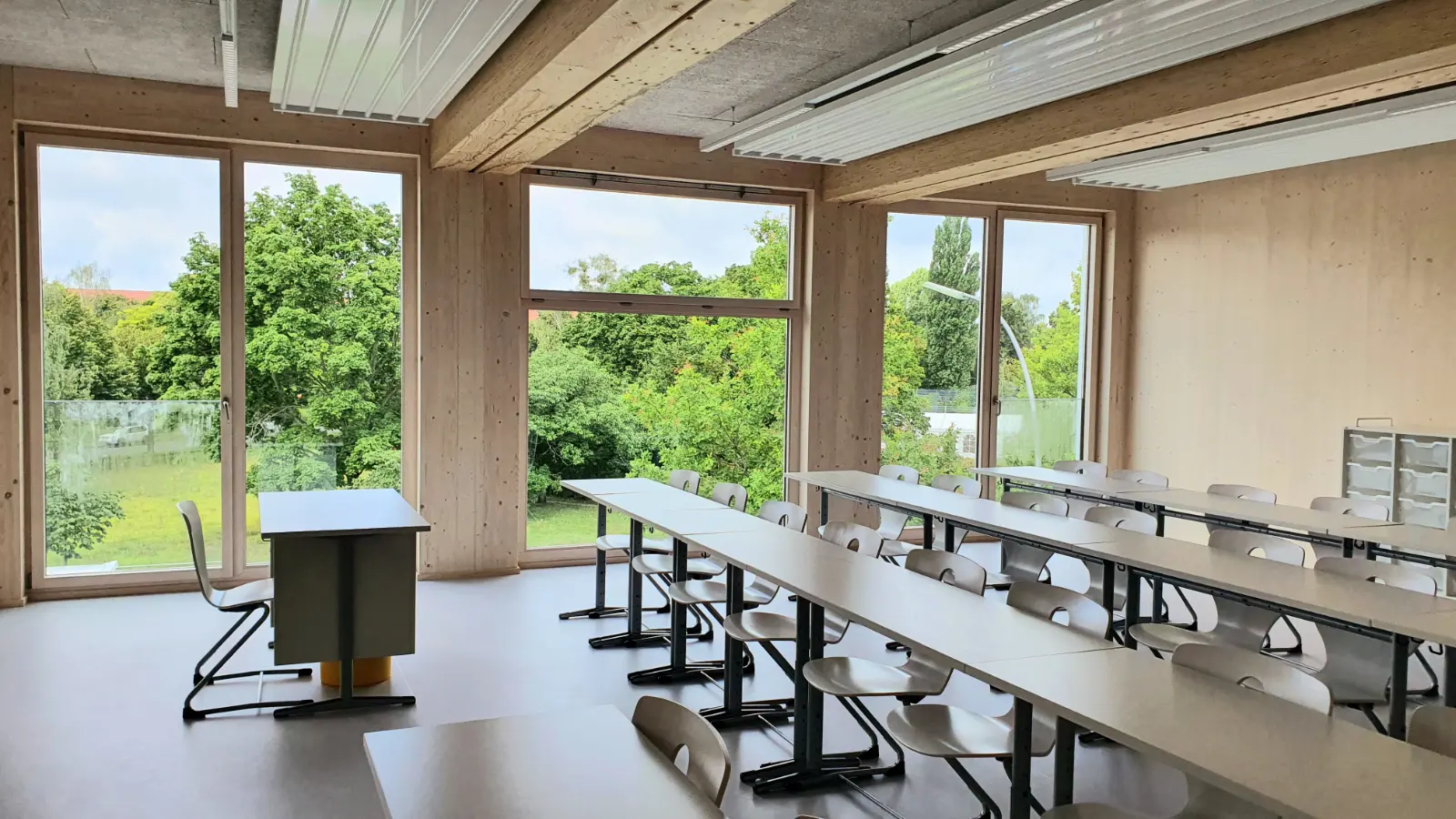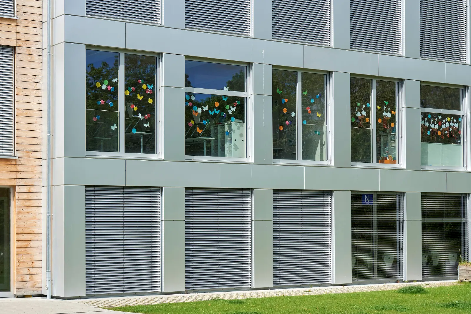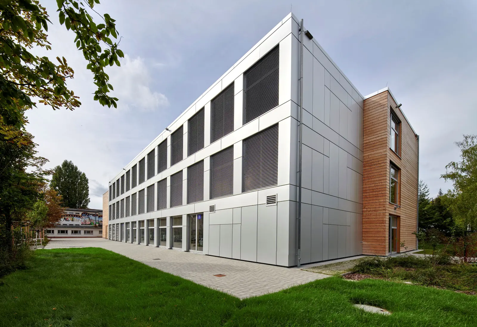 Die Schulergänzungsgebäude sind als 50m langer und 20m breiter Baukörper mit einem extensiv begrünten Attikaflachdach konzipiert. Die Module werden mit einem Vorfertigungsgrad von bis zu 90% auf die Baustelle geliefert und dort montiert.