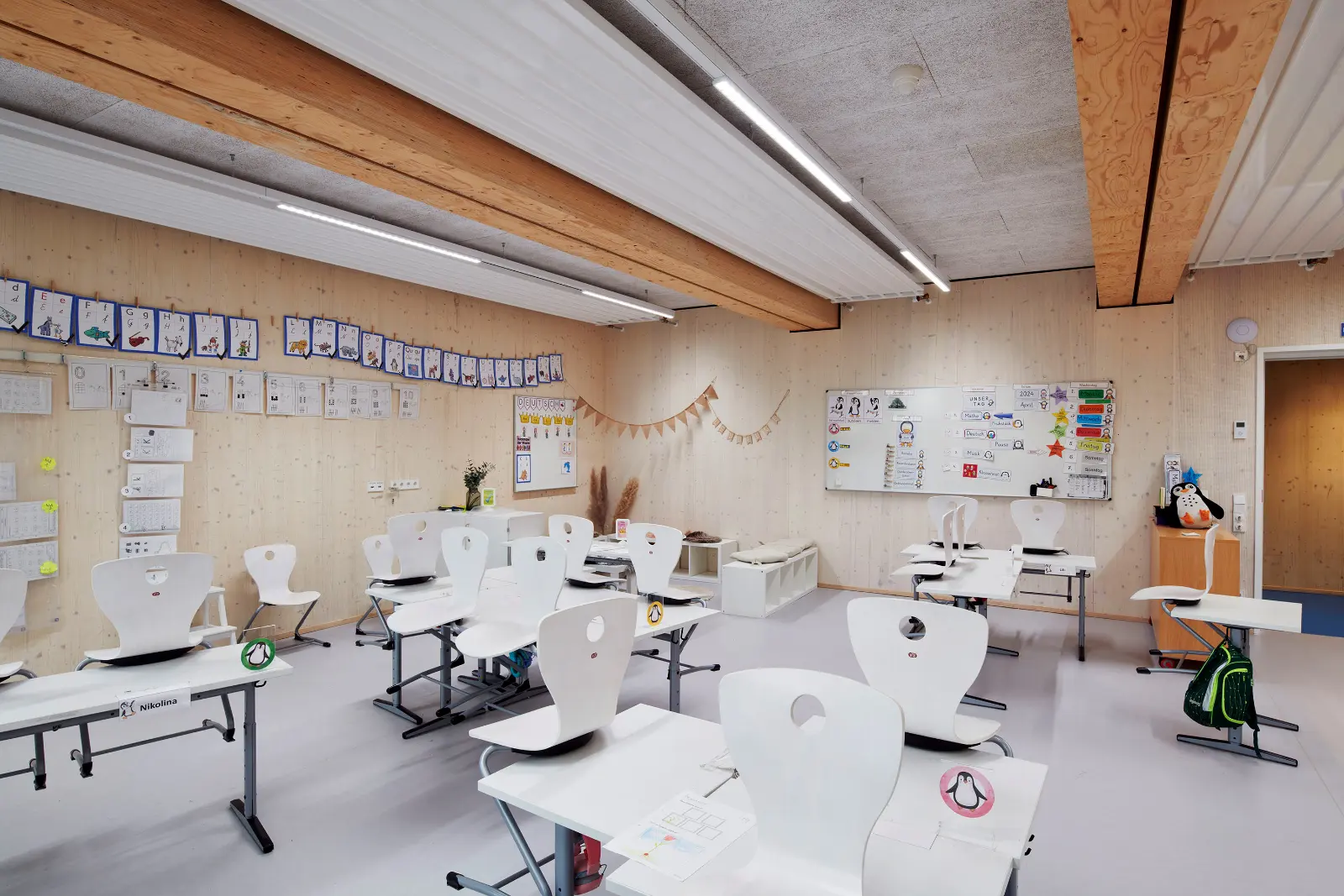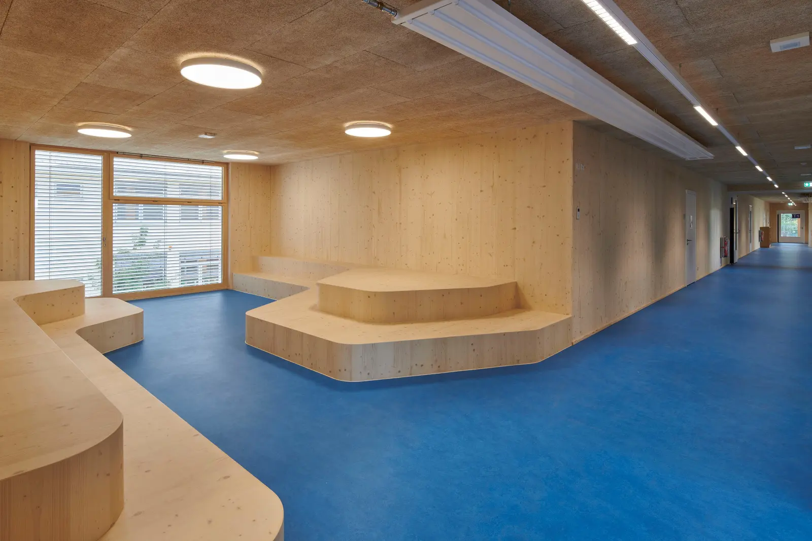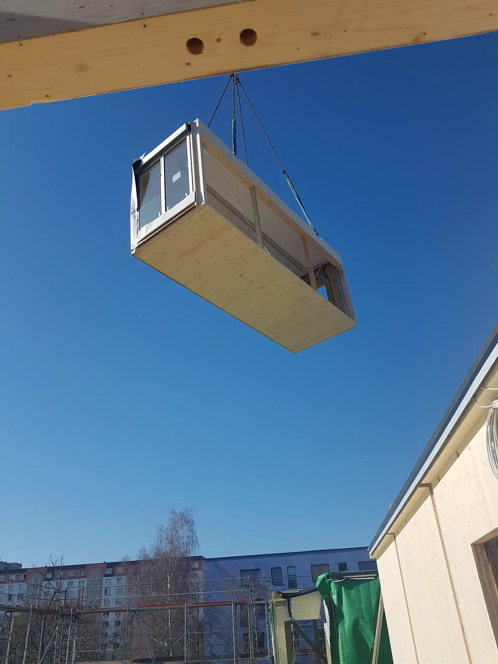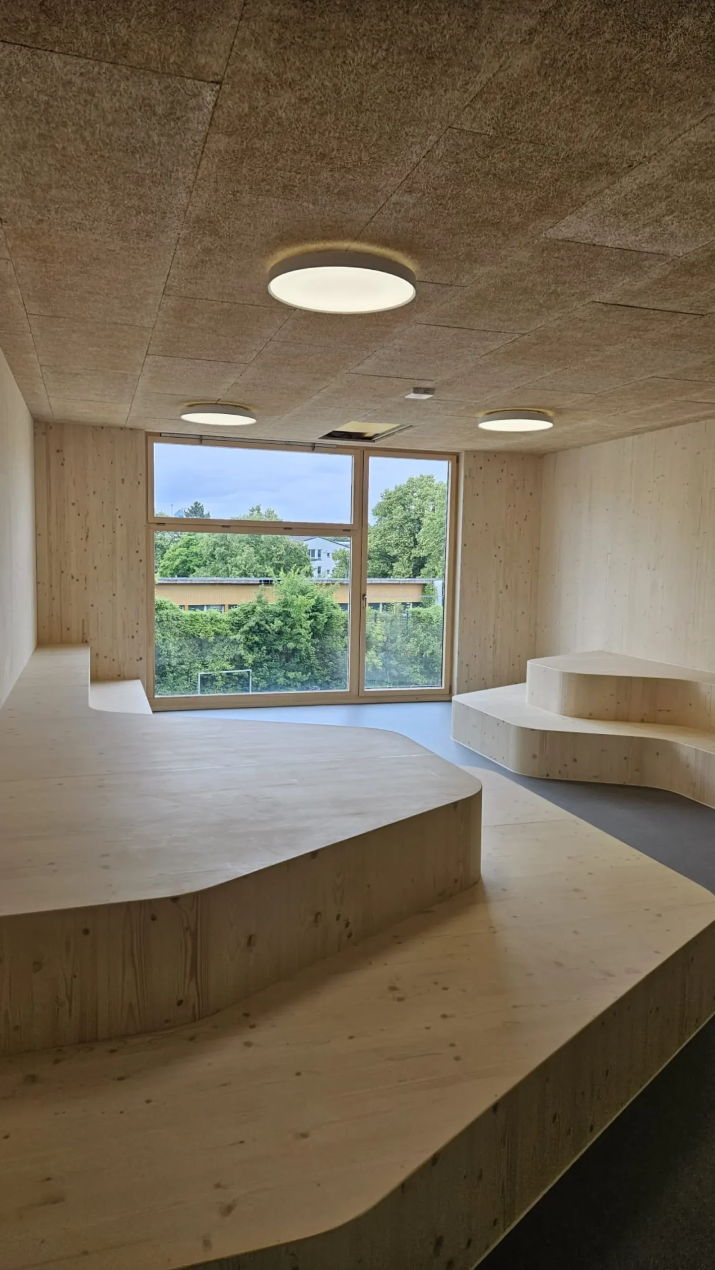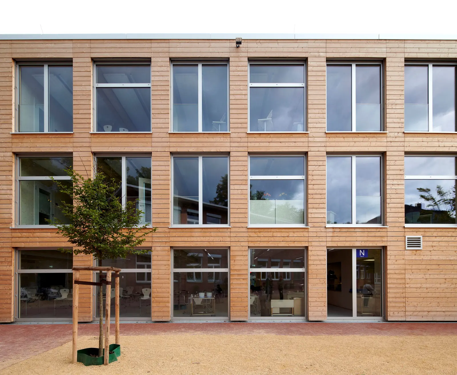 Die Schulergänzungsgebäude sind als 50m langer und 20m breiter Baukörper mit einem extensiv begrünten Attikaflachdach konzipiert. Die Module werden mit einem Vorfertigungsgrad von bis zu 90% auf die Baustelle geliefert und dort montiert.
