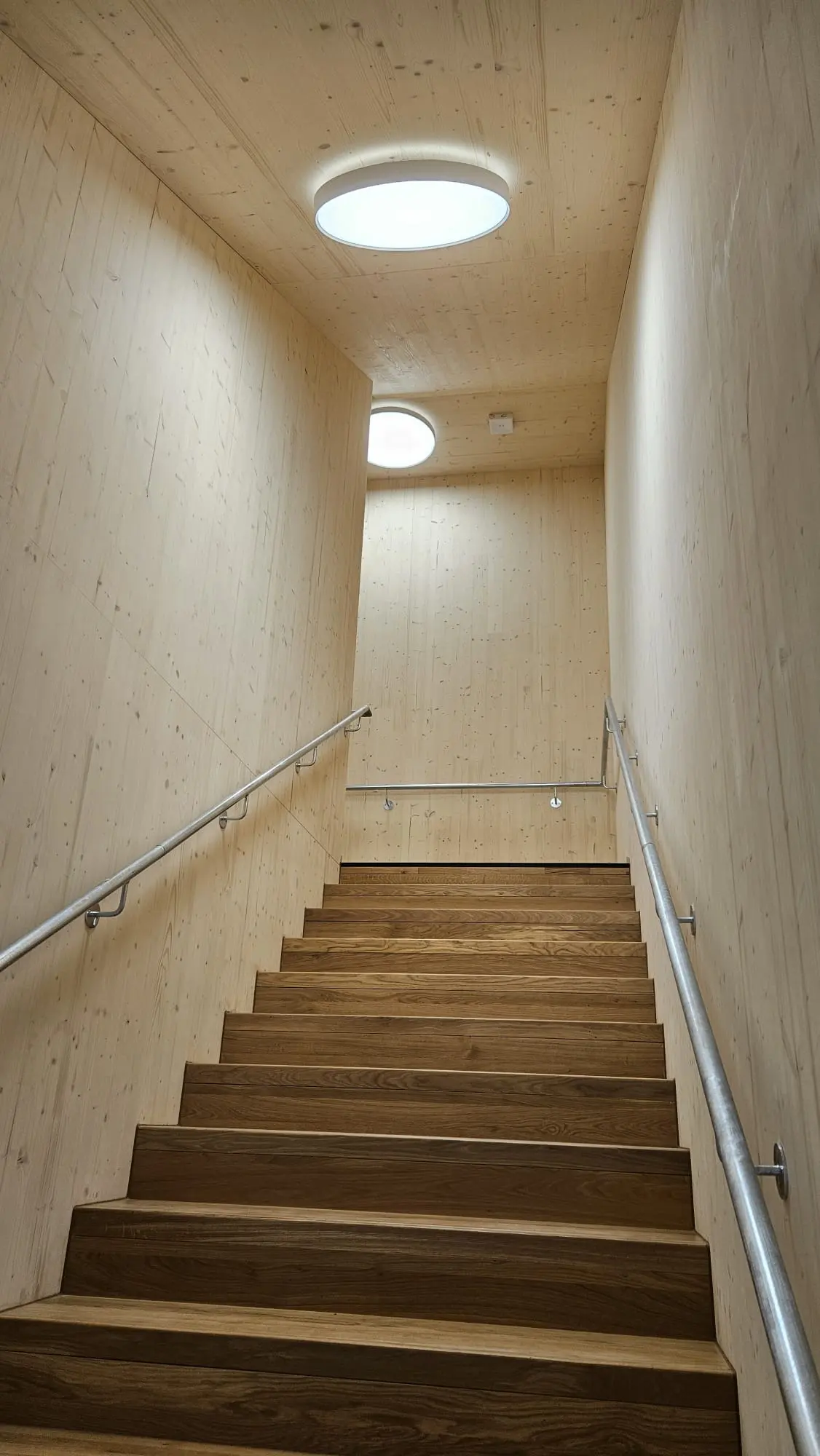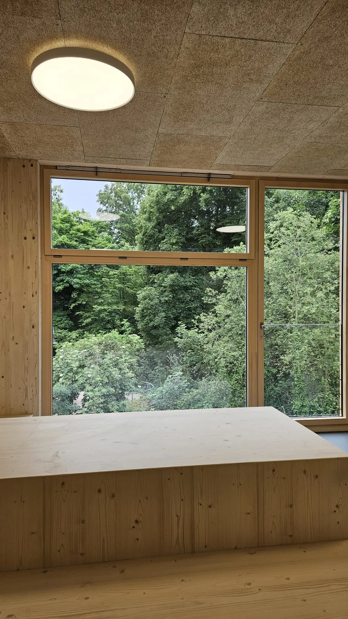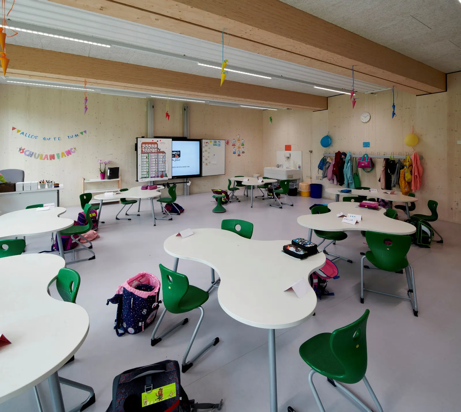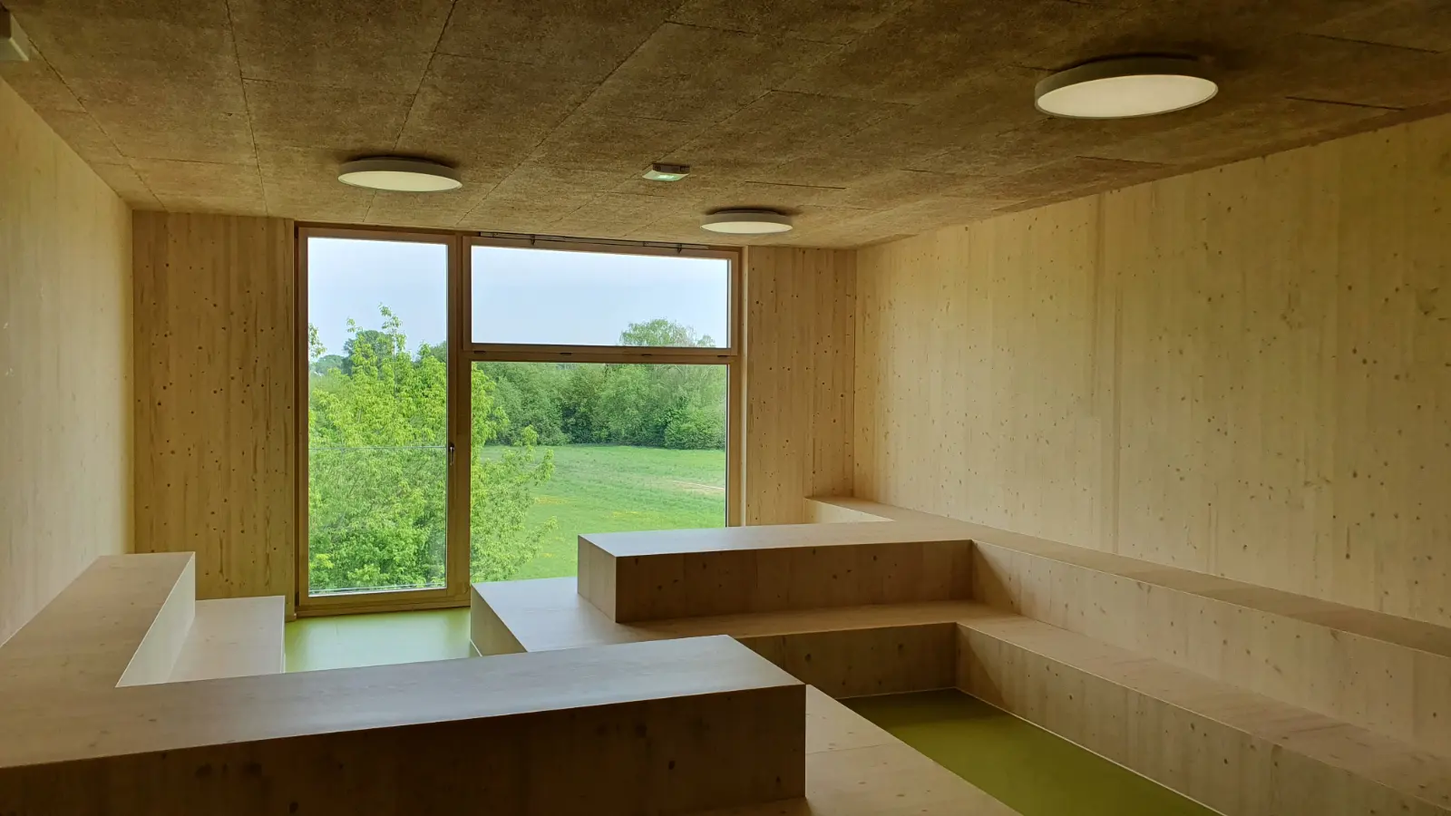 Die Schulergänzungsgebäude sind als 50m langer und 20m breiter Baukörper mit einem extensiv begrünten Attikaflachdach konzipiert. Die Module werden mit einem Vorfertigungsgrad von bis zu 90% auf die Baustelle geliefert und dort montiert.